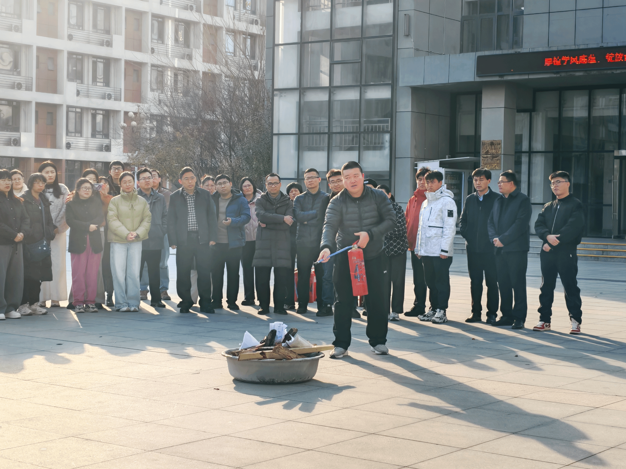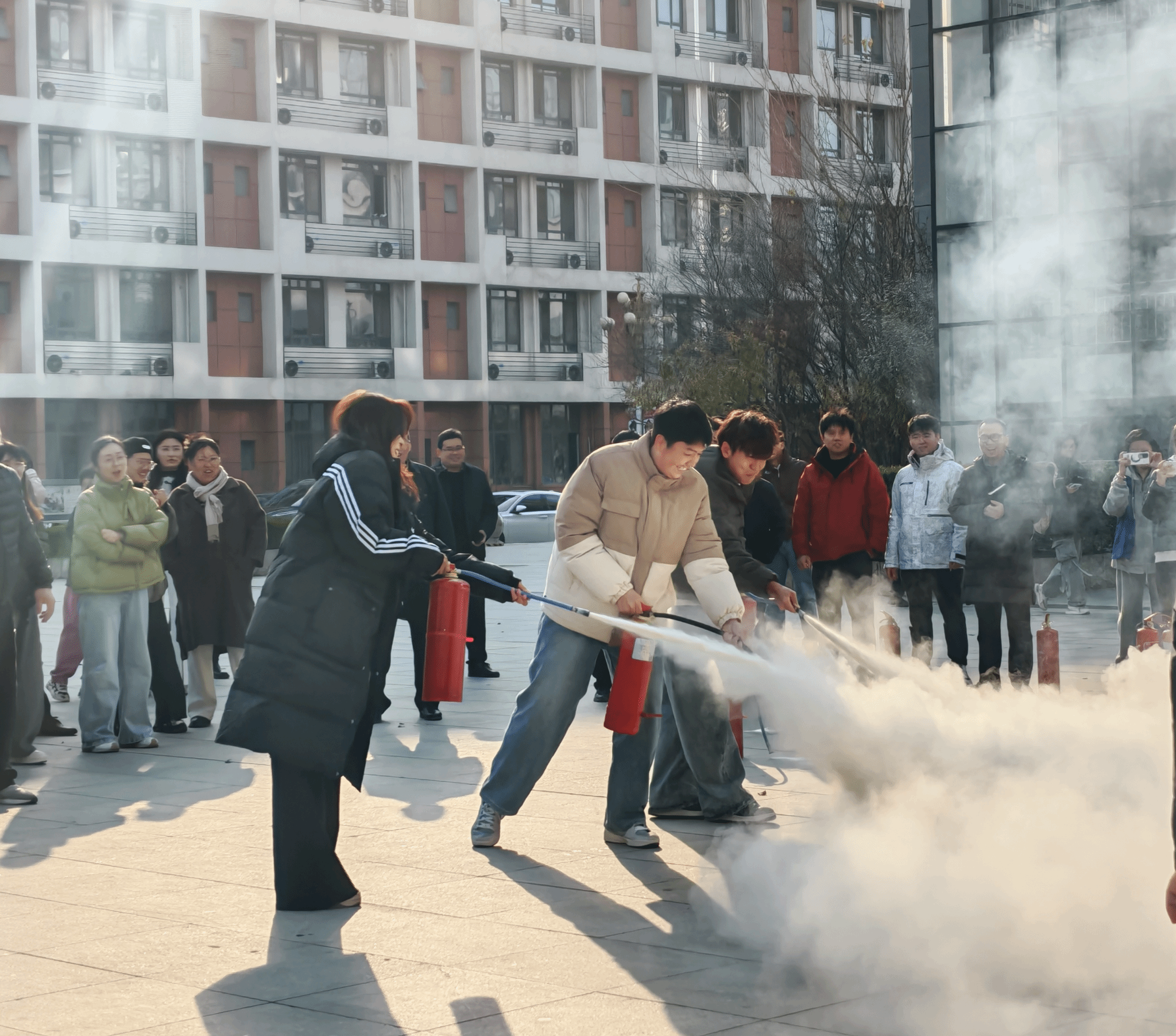 集结完毕后,消防科人员为师生讲解灭火器类型、适用场景及“提、拔、握、压”操作步骤,着重强调安全距离与喷射要领,并现场进行灭火演示。在专业指导下,学生代表依次操作灭火器进行实操演练,工作人员及时纠正动作偏差,确保参训人员掌握初期火灾扑救技能。