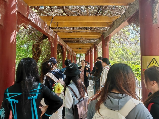 随后,实习队伍按照分组,分区域开展实地调研。在校园长廊、滨水区域、绿化节点等多个场地,刘玉芝老师结合现场环境,为同学们细致讲解了校园景观规划的核心要点:从场地的现状植被、空间尺度、人流流线,到景观功能的适配性、师生使用需求的满足,再到地域文化元素的融入、生态可持续设计的应用,刘老师以实景为课堂,逐一拆解景观规划的设计逻辑,引导同学们发现校园景观现存的问题,并启发同学们思考优化方向。