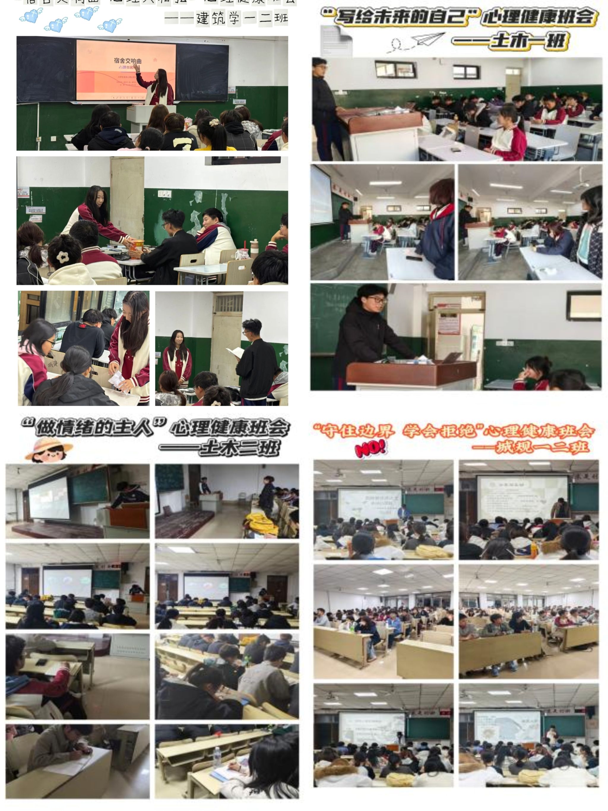 各班级围绕“撕掉标签,遇见‘多面’自己”“做情绪的主人”“与压力共舞,做从容的追光者”“我命由我不由天”“写给未来的自己”等核心主题,创新设计案例研讨、情景模拟、团队协作游戏、心理测评等互动环节。主讲人运用生活化语言解读心理健康知识,重点解析学业适应、情绪管理、人际交往等常见问题的应对策略,引导同学们科学认识心理变化规律,掌握积极心理学实用技能。在分享环节中,同学们主动敞开心扉,交流备考焦虑的调适方法、宿舍关系的经营技巧等真实体验,通过真诚对话实现思想碰撞与情感共鸣,在轻松氛围中释放心理压力,发现自我与他人的内在优势,强化心理韧性与集体归属感。同学们纷纷表示,在未来的学习生活中,将以更加积极坚韧的心态面对成长挑战,践行自我关怀与人际包容,在青春赛道上稳健前行、逐梦远航。