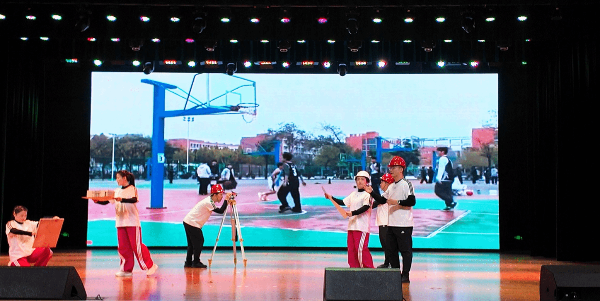 节目开场,我院教职工生动模拟了绘制蓝图、实地精准测绘、专注巡视工地等专业工作场景,展现了深耕教育的严谨形象。随着一段习近平总书记关于健康中国的重要论述广播响起,全体队员闻令而动,迅速集结。在《我和我的祖国》的激昂旋律中,他们以充满活力的舞步完成从“专业严谨”到“激情绽放”的转变,用整齐划一的动作展现了新时代教育工作者的昂扬风貌。表演最终在铿锵有力的定格造型中达到高潮,背景大屏赫然呈现“深耕专业,铸造辉煌;活力健身,为国担当”的十六字口号,生动诠释了我院教职工将专业精神与健康理念相融合,以强健体魄投身教育事业的坚定决心。经过激烈角逐,我院代表队最终以97.38分的优异成绩荣获大赛一等奖。